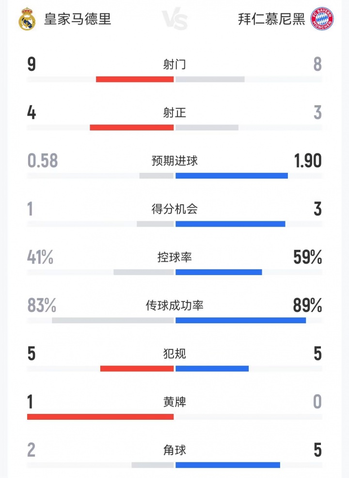 04月08日讯 欧冠1/4总决赛 首局 ,皇马暂0-1拜仁。半场数据如下↓
